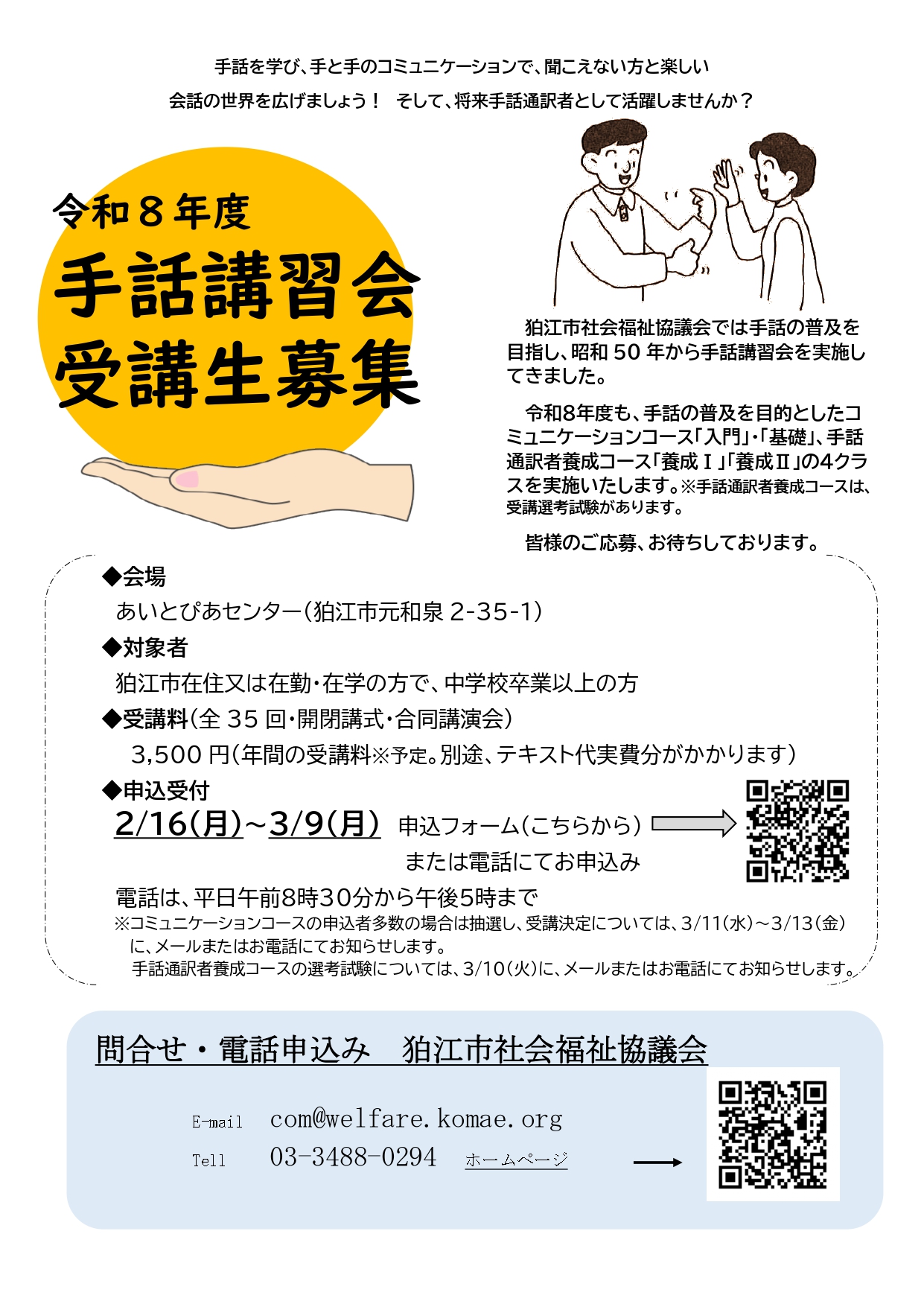 狛江市社会福祉協議会では手話の普及を目指し、昭和50年から手話講習会を実施してきました。今年度も、手話の普及と通訳者の養成を目的とし、入門・基礎・養成Ⅰ・養成Ⅱの4クラスを実施いたします。皆さまのご応募、お待ちしております。詳しくは以下のページをご覧ください。