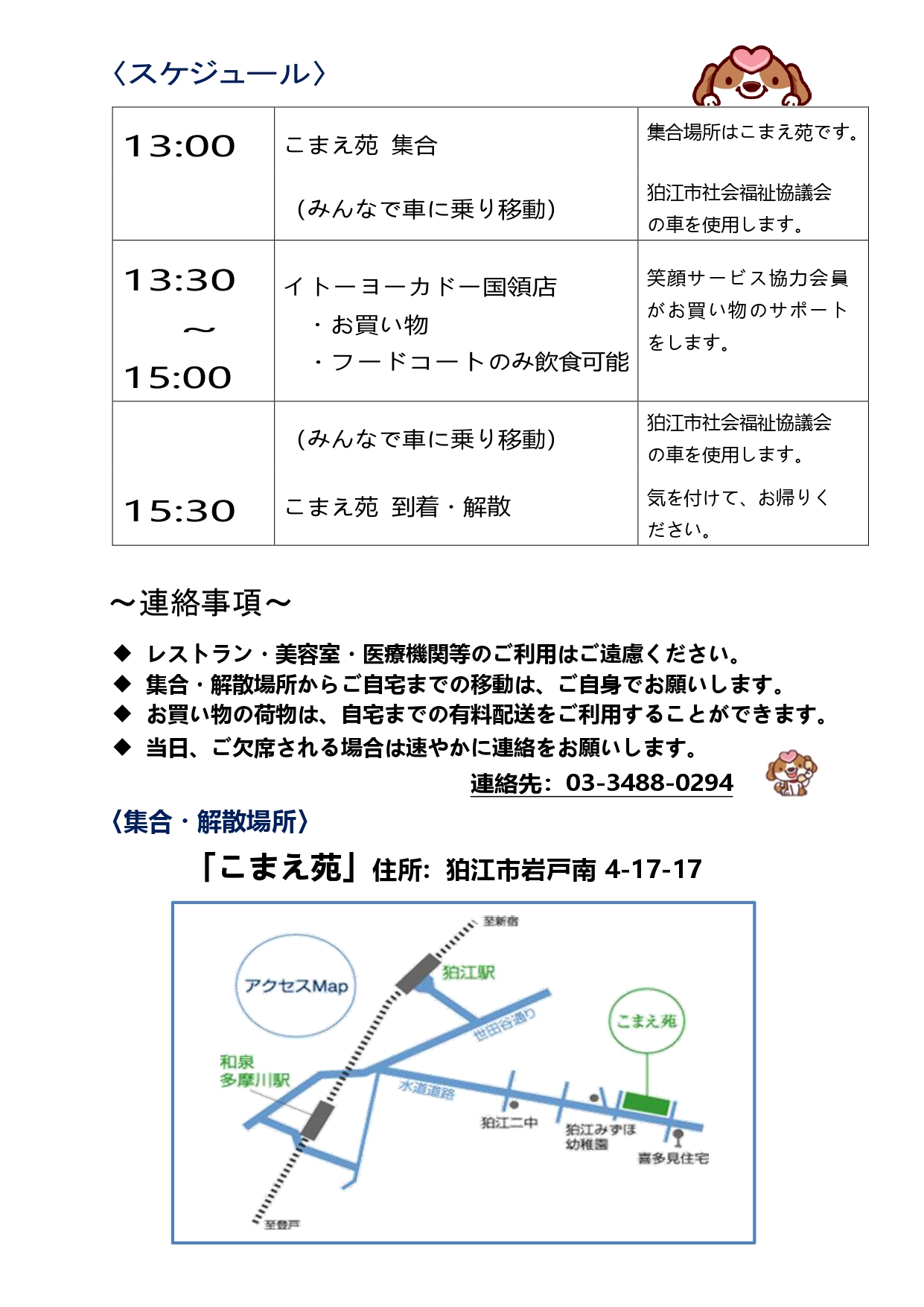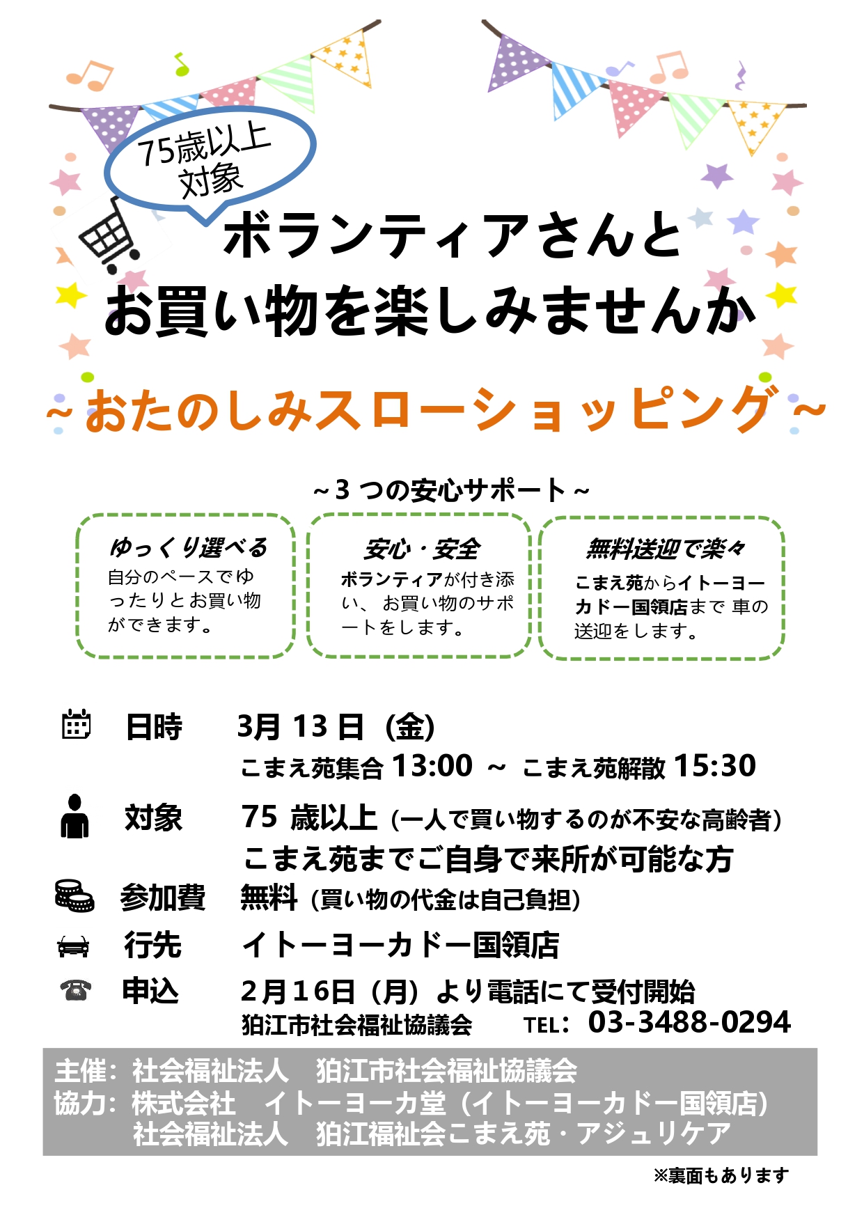 狛江市社会福祉協議会の自動車を利用します。一人での買い物が不安な高齢者に、買い物やフードコートで楽しむ時間を提供します。なお、笑顔サービス協力会員がお買い物をサポートします。